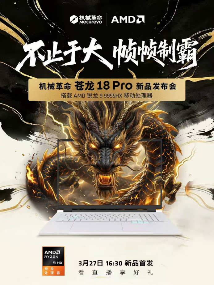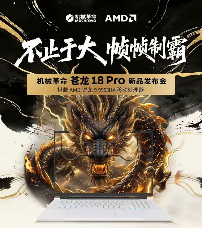 3月27日,机械转换举办了以“不啻于大,帧帧制霸”为主题的苍龙 18 Pro发布会,重磅发布了至高搭载AMD锐龙9 9955HX旗舰处理器的18英寸大屏游戏本苍龙 18 Pro,同步亮相的还有苍龙 16 Pro、蛟龙 16 Pro等全眷属新品矩阵。
