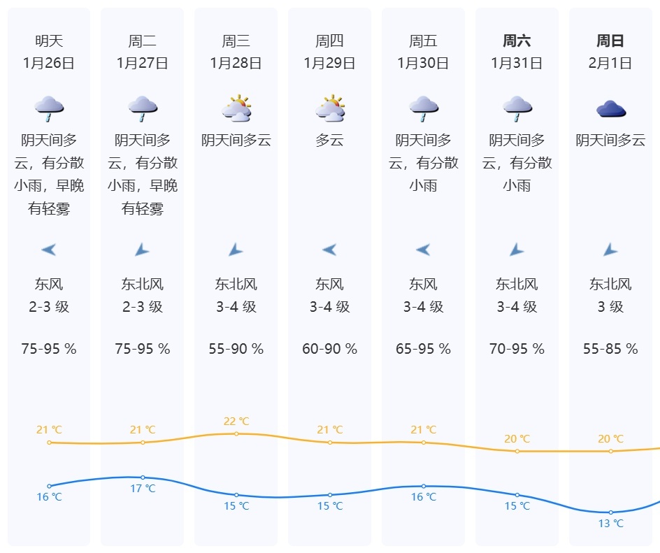 26-27日云量加多,湿度增大,间中有小雨,早晚有轻雾或雾,干燥进度有所缓解,最低气温不息回升,有出现轻细回南天的可能。