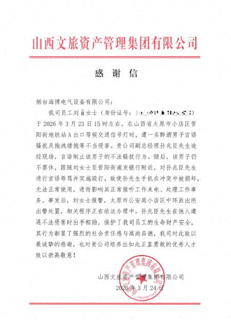 过后,山西文旅财富处治集团有限公司专程发来感谢信,对孙兆臣的善举致以崇高敬意,并高度赞美烟台海博电气开辟有限公司培养出了如斯耿直勇敢的优秀东谈主才。