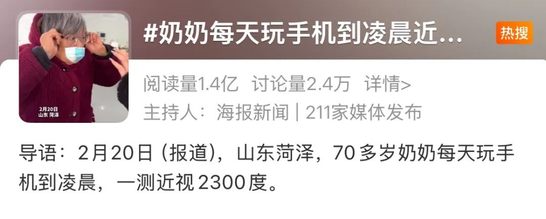 不久前,一则新闻冲上热搜:一位70多岁的老奶奶,每天睁眼就刷手机,沿路刷到凌晨,连觉都顾不上睡,终末查验出近视高达2300度,大夫直言再这么下去可能濒临视网膜病变的风险。