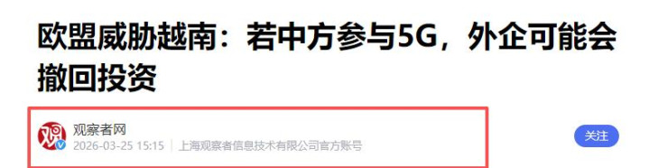 不雅察者网2026-03-25《欧盟禁锢越南:若中方参与5G,外企可能会畏怯投资》