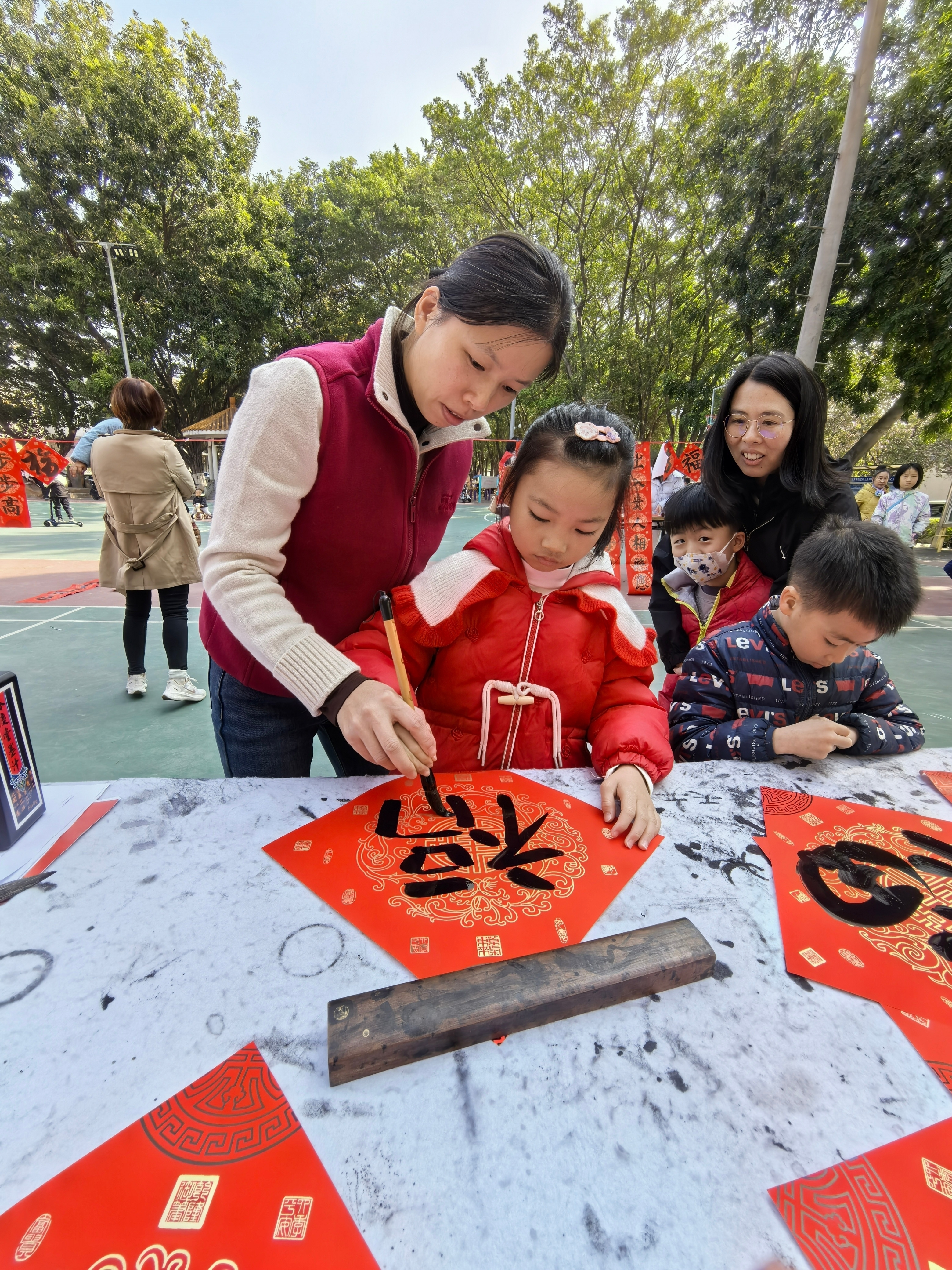 这次看成邀请了番禺区硬笔书道家协会的多位主干力量,声势巨大。除宋桂发主席与特邀嘉宾苏英英外,还有协会副主席刘颂茂、李伟林,主席团成员甘春院,副通告长莫申义,以及苏雅雯、苏子竣等理事与主干会员共同参与。他们把柄村民的喜好现场创作,有的写“福”字,有的写对子,有的写祥瑞语,让每一位前来的村民都能带着悠闲的作品回家。