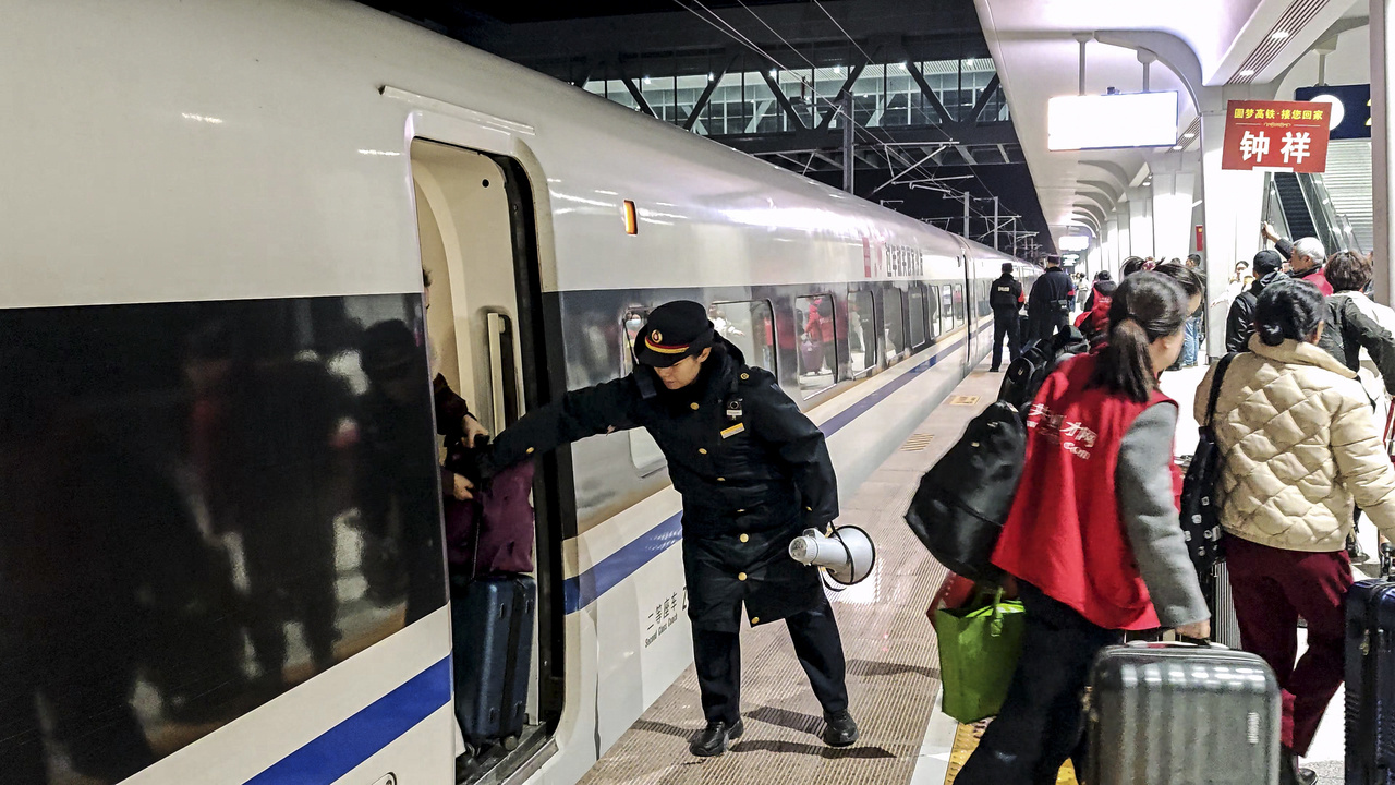 2月8日21时51分,跟着深圳北至钟祥南G1033次返乡高铁务工专列告成抵达,沪渝蓉沿江高铁武宜段3趟务工专列沿路到站,至此1700名荆门籍务工东谈主员告成返乡。这是京山、钟祥两市迈入高铁时期后,当地民众初度搭乘高铁“点对点”返乡。