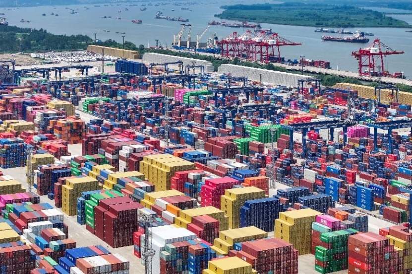 2025年7月14日,航拍长江沿线南京龙潭港出进口集装箱船埠。(贵府图) 中新社记者 泱波 摄