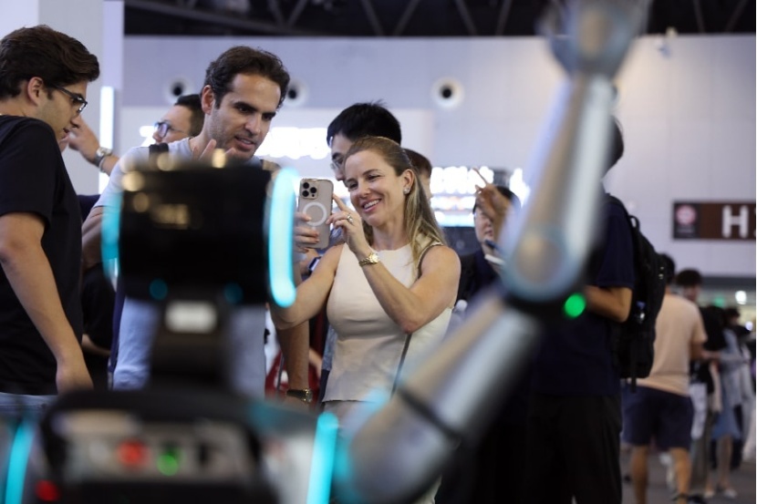 2025年7月,在上海举办的2025寰球东谈主工智能大会上,一款中国制造的机器东谈主诱骗番邦不雅众。 中新社记者 汤彦俊 摄