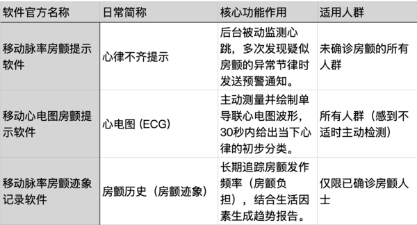 简便总结一下来看,现时对于腹黑健康,AppleWatch一共带来了三个软件,餍足不同用户。为了让公共更直不雅地交融AppleWatch在心血管限度的这几项中枢功能,咱们不错通过底下这个表格,明晰地看出它们的具体作用和适用规模: