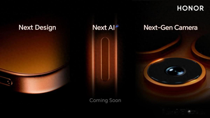 图片:荣耀600系列官方预热图,展示Next Design、Next AI与Next-Gen Camera三大主题,橙金色曲面机身初露条理