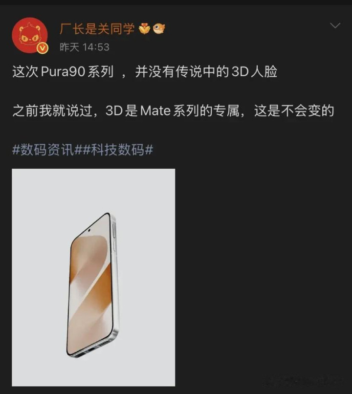 微博上的数码博主“厂长是关同学”领会,华为Pura 90系列将不会配备传奇的3D面部识别功能。这项顶尖技艺仍将由Mate系列独占。此前多位爆料者曾指出,Pura 90系列终于将得到3D面部考证竖立。但华为的有计划似乎有所不同。