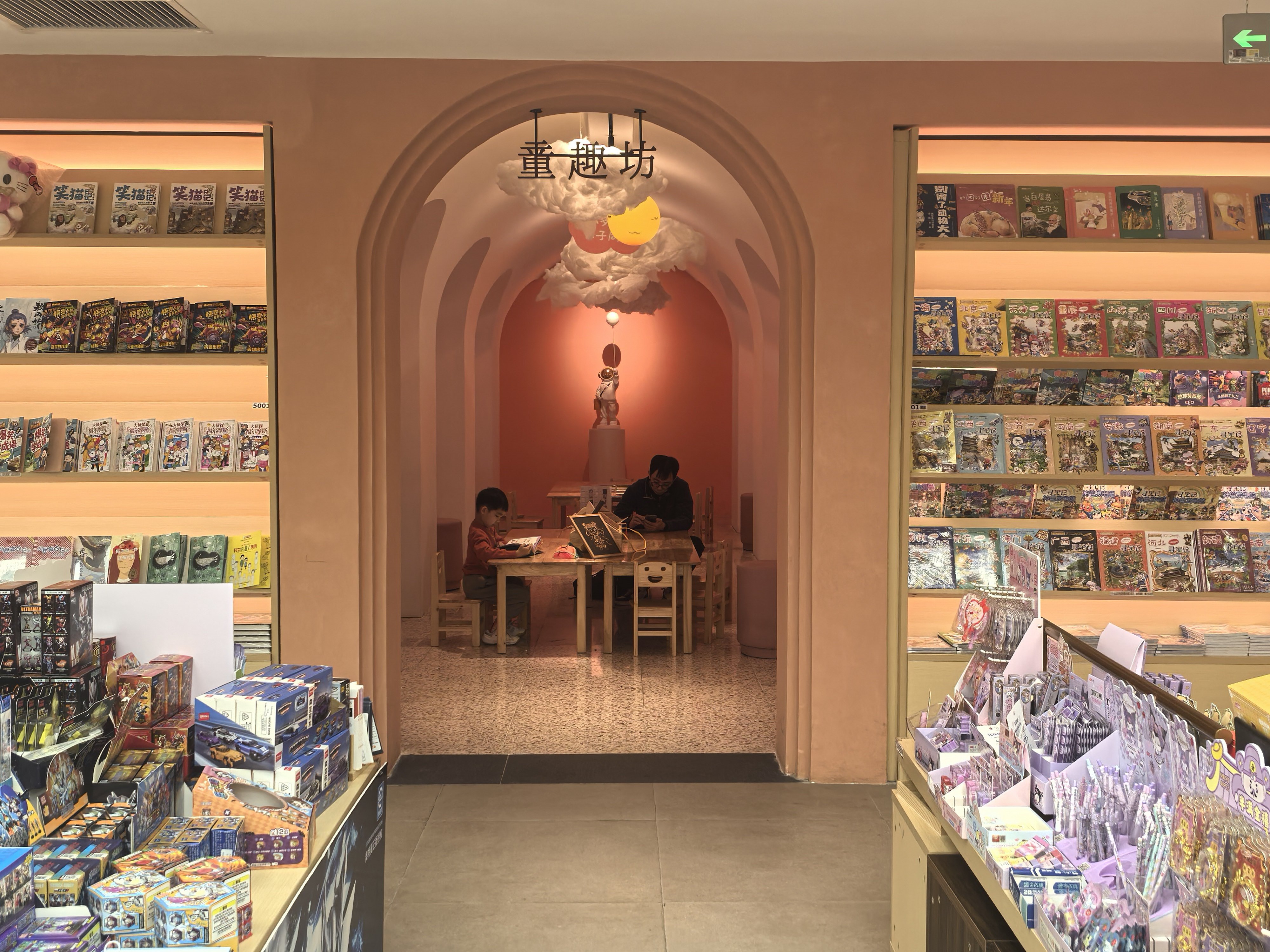 走进去,记者看到琳琅满方针书本,伏案作事的后生,带娃在道路上起步当车的家长。店里联想简陋高古,有特意的童趣坊与阅动坊,长长的走廊里也摆满了书,大堂里还有咖啡与简餐。