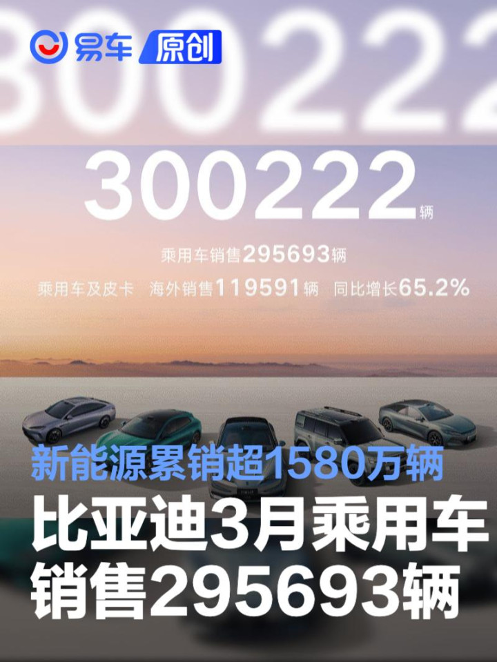易车讯4月1日,比亚迪公布最新销量数据。2025年3月,比亚迪销售300222辆,其中乘用车销售295693辆。乘用车及皮卡国外售售119591辆,同比增长65.2%。2026年1-3月,比亚迪集团累计销售700463辆,金年会官网首页入口乘用车及皮卡国外累计销售319751辆。